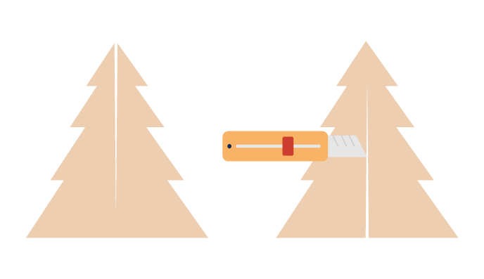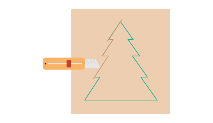 Naudojant žirkles, peilį ir liniuotę, iškirpk kartoną pagal eglutės formą. Norint užtikrinti, kad bus iškirpta detaliai, naudok tinkamiausią įrankį.