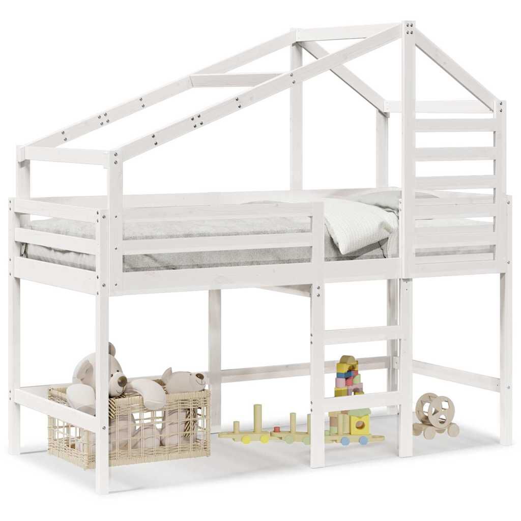vidaXL Aukšta lova su kopėčiomis ir stogeliu, balta, 90x190cm, pušis