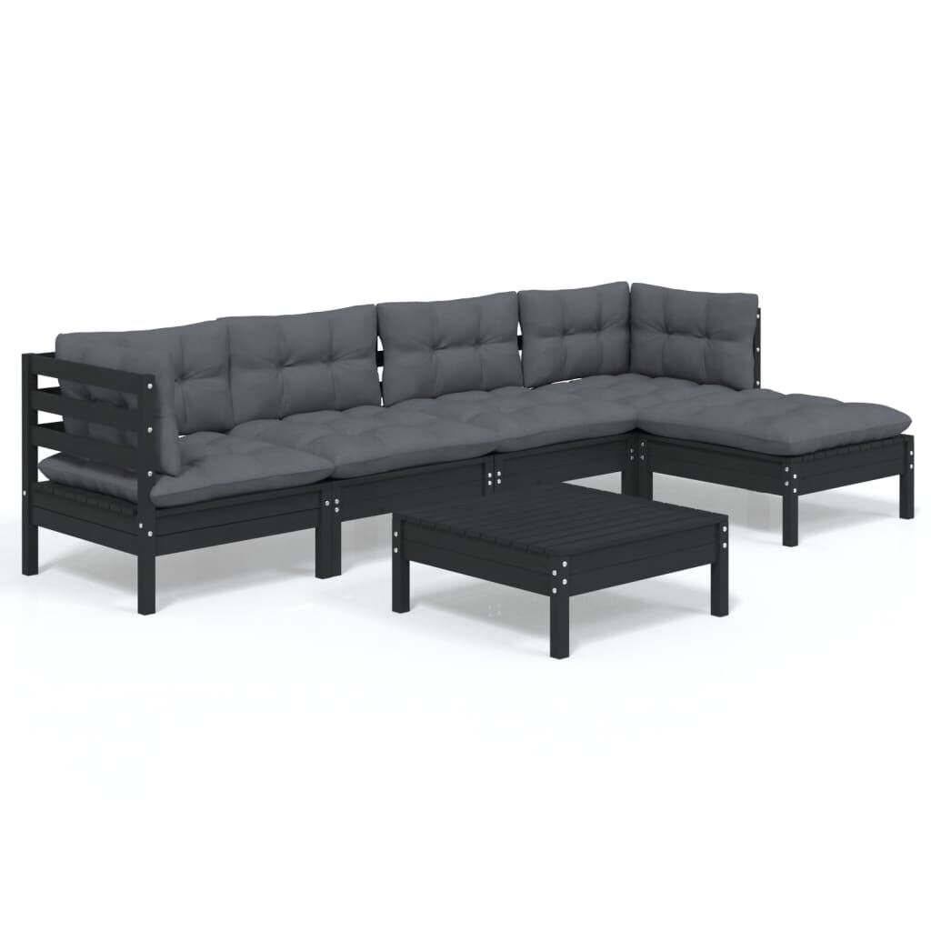 vidaXL Sodo komplektas su pagalvėmis, 6 dalių, juodas, pušies mediena