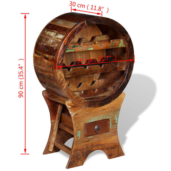 Šis senovinio stiliaus medinis stovas vynui yra pagamintas iš perdirbtos medienos masyvo. Jis bus tobulas pasirinkimas tikriems vyno gurmanams. Elegantiška vyno lentyna suteiks vintažinio šarmo jūsų virtuvei, valgomajam ar svetainei. Spintelė vyno buteliams yra su patogiu stalčiumi aksesuarams ir erdve 10 vyno butelių, todėl joje galėsite laikyti viską, ko gali prireikti mėgavimuisi puikia jūsų vyno kolekcija.