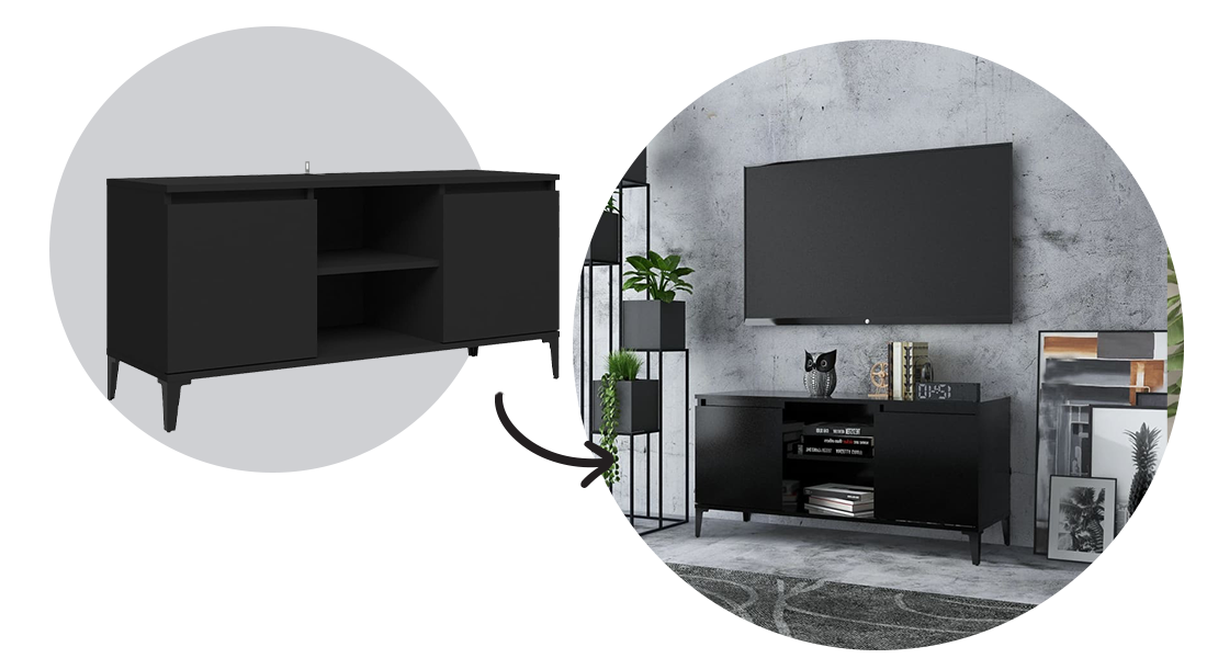 Norint sukurti tikrą pramoninį pojūtį, naudok baldus, kuriuose dera dvi populiariausios pramoninės medžiagos – mediena ir metalas. Ieškok interjero dalių, kurios gali lengvai tapti pagrindiniu erdvės akcentu, pavyzdžiui, juodo medinio televizoriaus komplekto su metalinėmis kojelėmis ir atviromis lentynomis.