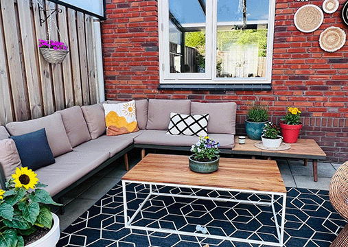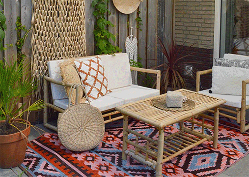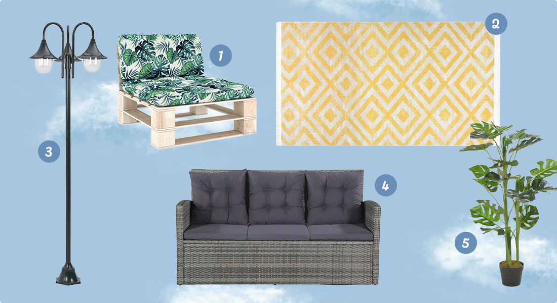 Ieškok spalvingų pagalvėlių, tekstūruotų kilimėlių, mirksinčių lempučių ir vazoninių augalų. Šie paprasti prisilietimai pavers tavo erdvę po atviru dangumi atsipalaidavimo prieglobsčiu, neišleidžiant daug pinigų.