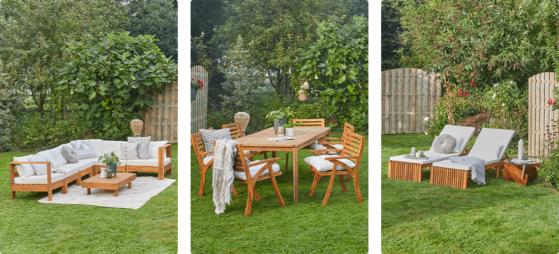 Medinių sodo baldų universalumas užtikrina, kad juos galėsi stilizuoti įvairiais būdais. Pavyzdžiui, mūsų tikmedžio medienos masyvo sodo valgomojo baldų komplektai puikiai tinka norint mėgautis valgymu lauke. Suteik dar daugiau komforto, padėjęs ant jų minkštas, savo mėgstamos spalvos pagalvėles.